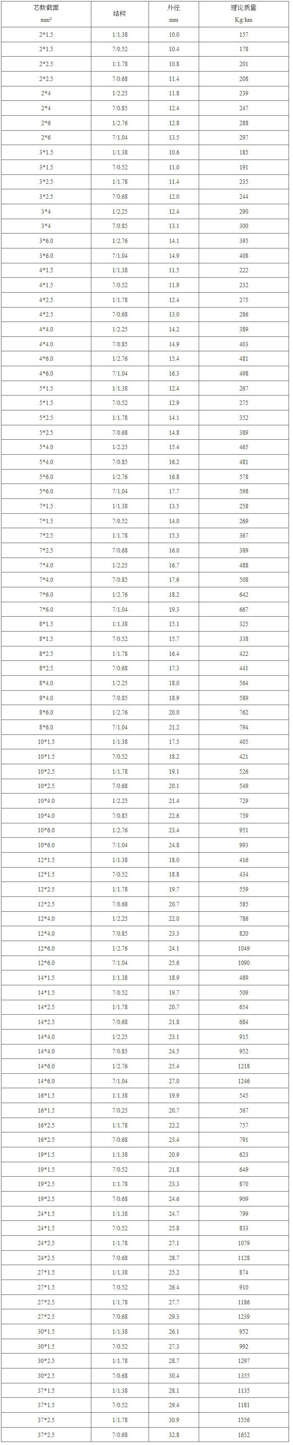 表(1)铜芯辐照交联聚乙烯绝缘低烟无卤阻燃电线电缆结构参数