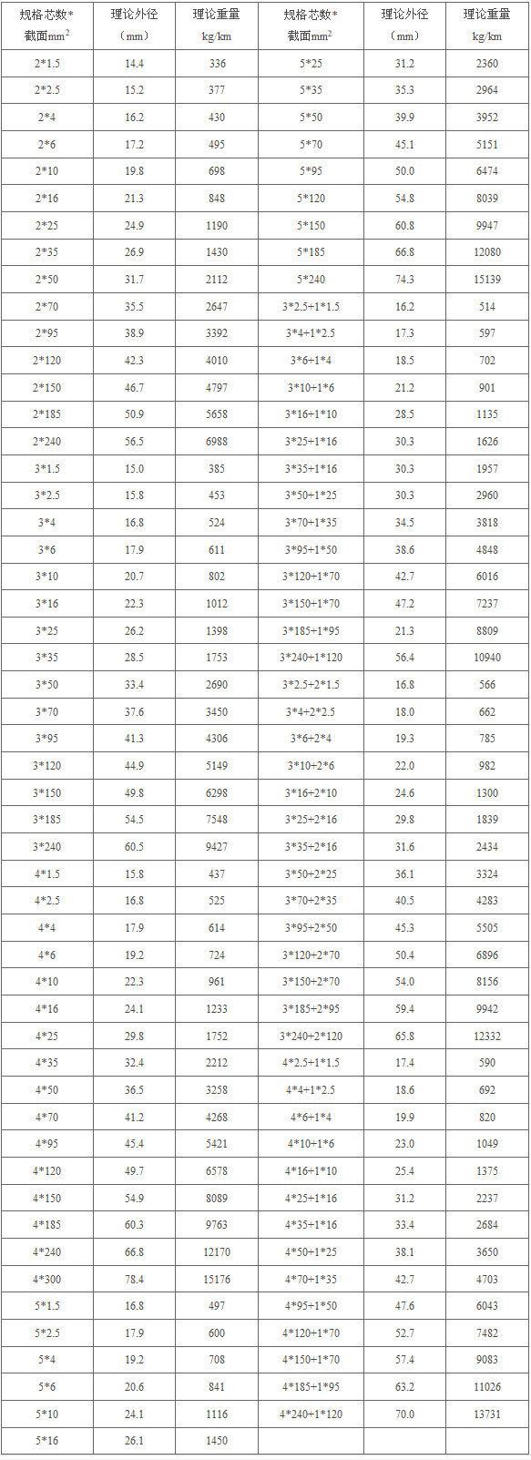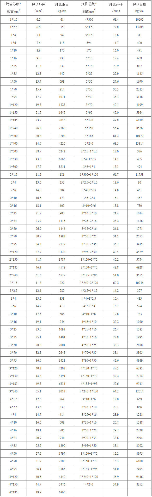 表(8)WDZN-YJ(F)Y22fu辐照交联聚乙烯绝缘钢带铠装聚烯烃护套阻燃耐火低烟无卤电力电缆